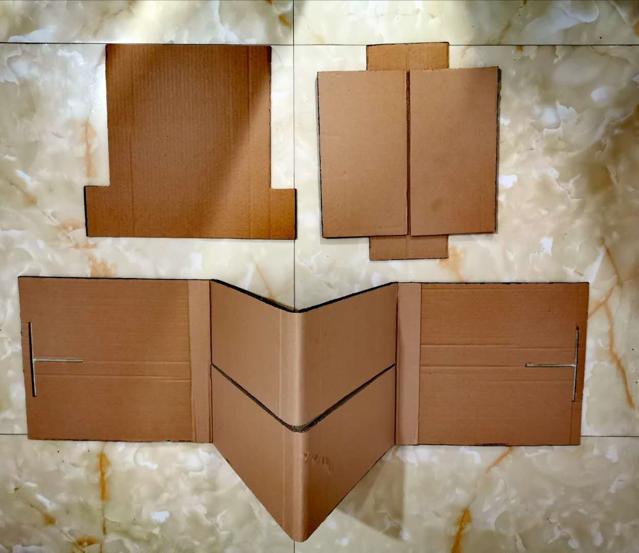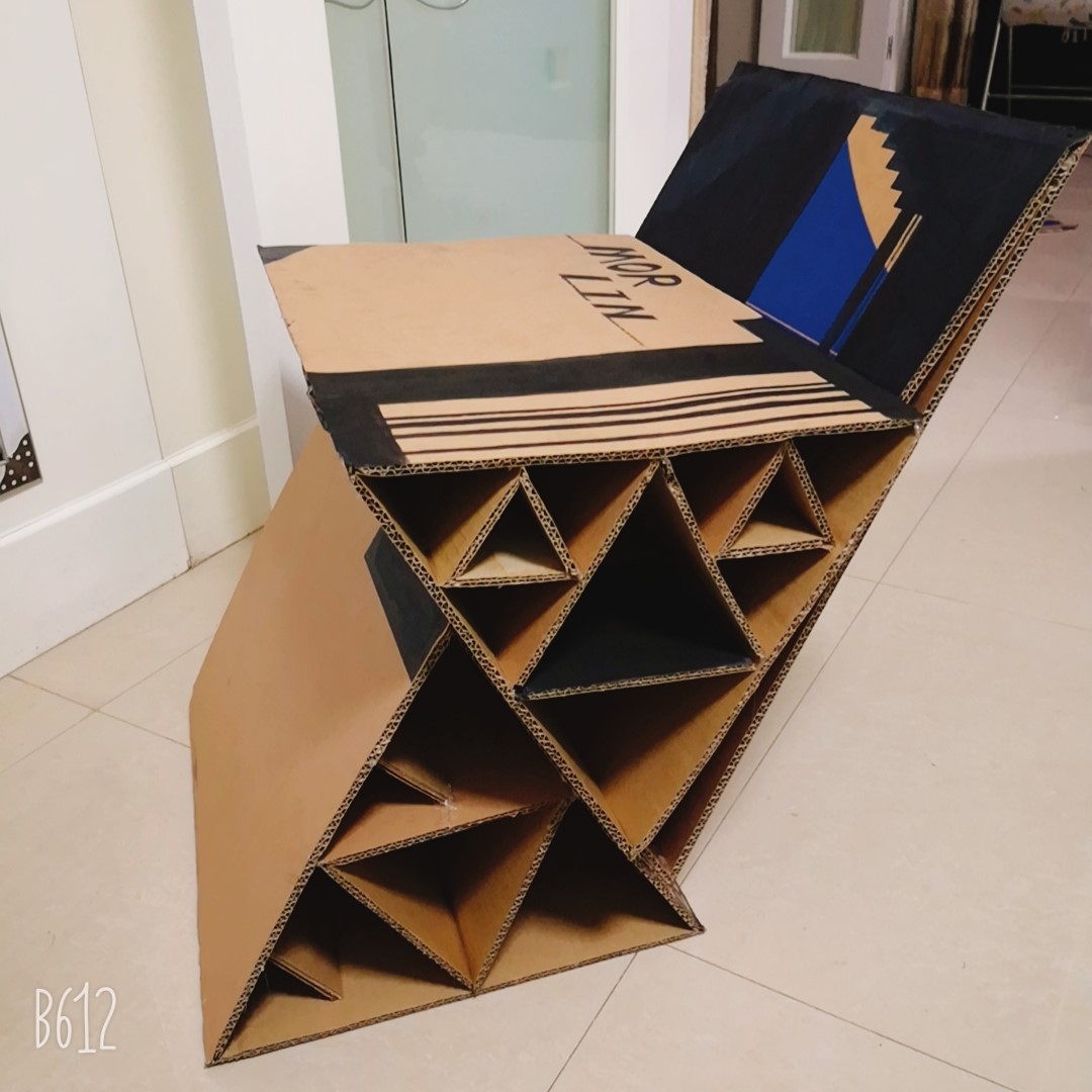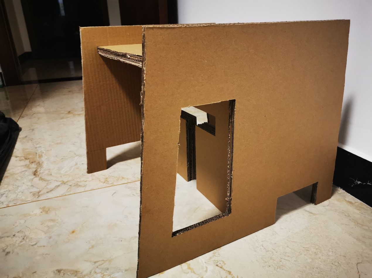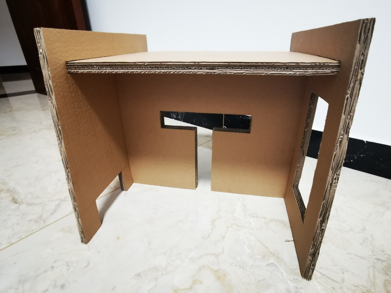 做的过程尽量不用胶,顶部经过思考,运用瓦楞纸两层的特性,将顶部与侧面卡住。坐具多处运用开槽避免了胶的运用,使坐具可拆解。