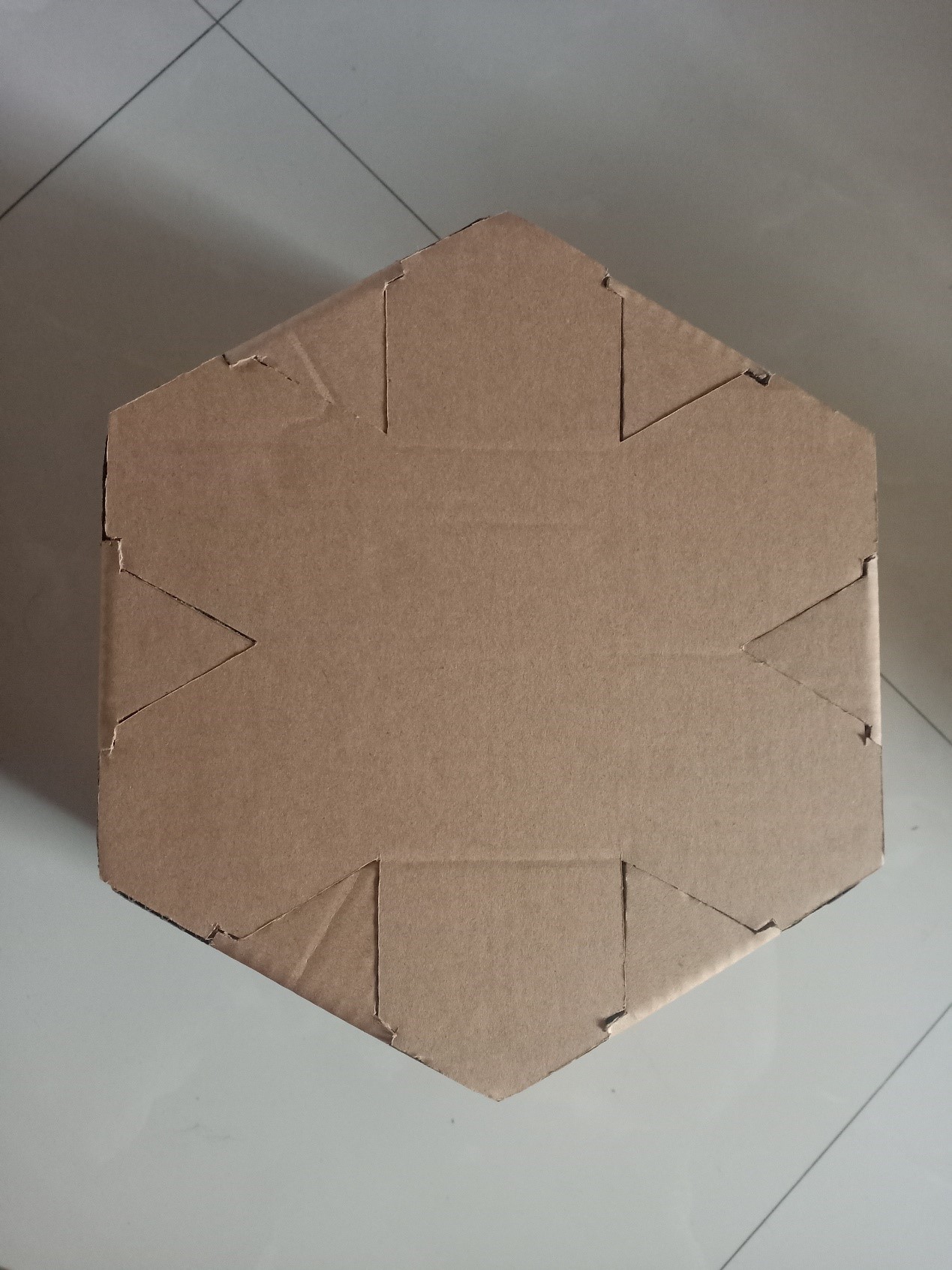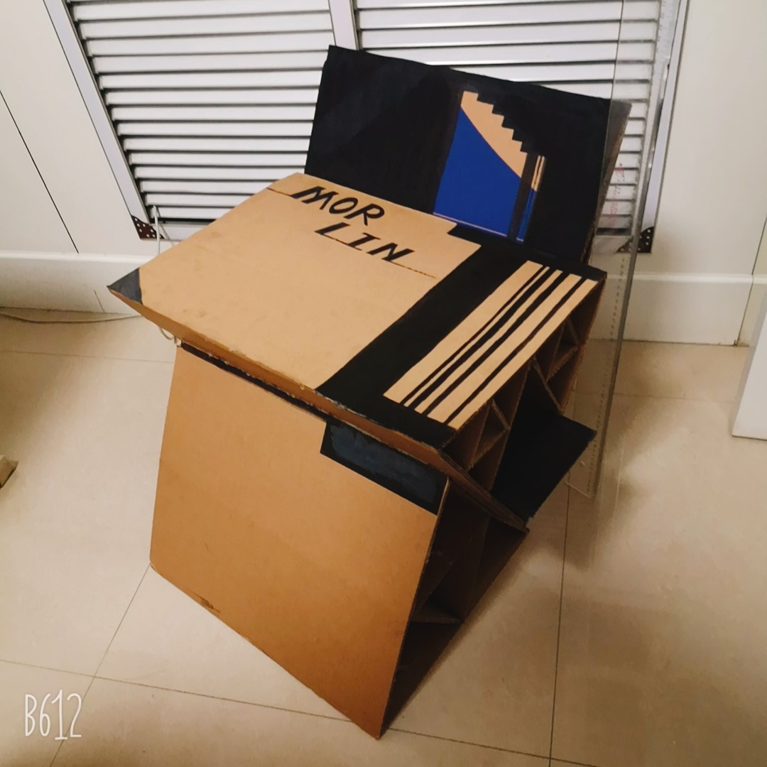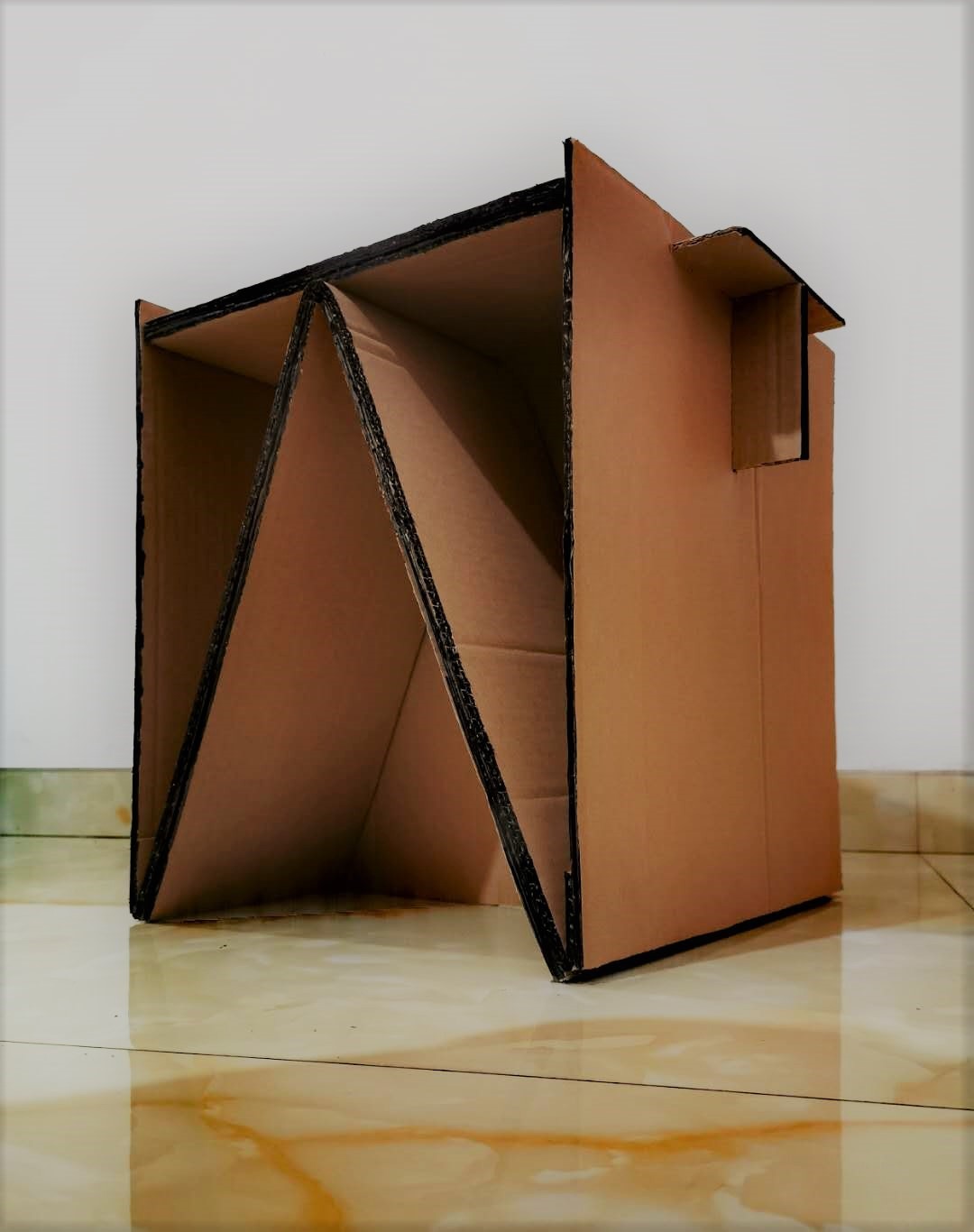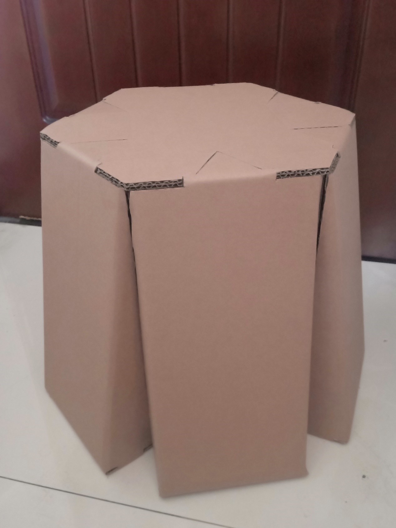 做的过程尽量不用胶,顶部经过思考,运用瓦楞纸两层的特性,将顶部与侧面卡住。坐具多处运用开槽避免了胶的运用,使坐具可拆解。