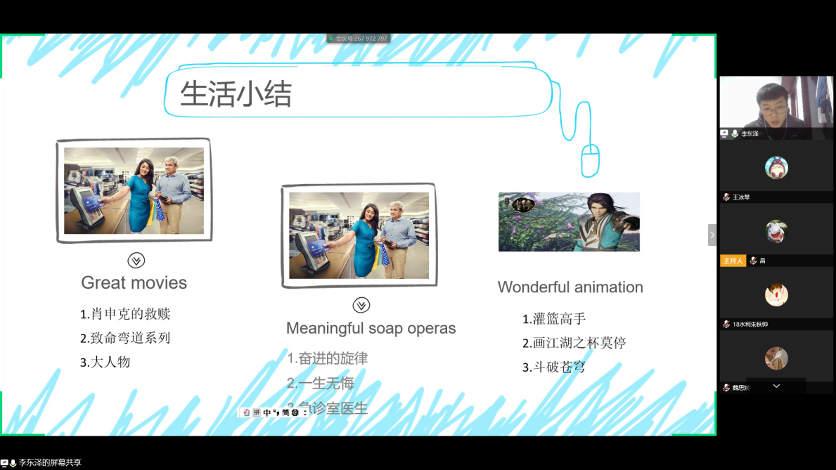 晚上7点,班会正式开始,在简短的介绍之后,同学们便开始了自己的分享。