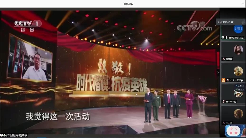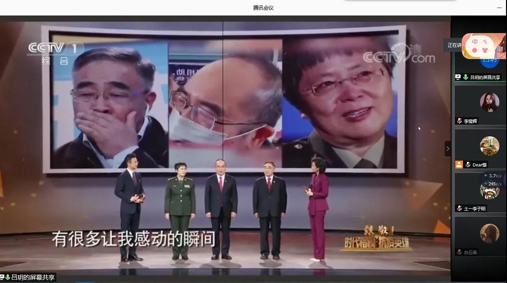 活动后半程,王憬慧、吕玥带领同学一起学习领略了伟大的抗疫精神。王憬慧指出抗疫精神可以用“生命至上、举国同心、舍生忘死、尊重科学、命运与共”五个词语来概括,这也是爱国主义、集体主义、社会主义精神的传承和发展,是对民族精神和时代精神的内涵的丰富。吕玥则带领大家一同重温了团歌《光荣啊!中国共青团》,激昂的旋律燃起了同学们的雄雄壮志,随后,吕玥播放了一段抗疫事迹视频--《致敬!时代楷模·抗疫英雄》。国家援鄂医疗队和军医援鄂医疗队与病毒短兵相接的抗疫事迹令同学们动容,同学们也更加直观地体会到了医者仁心。