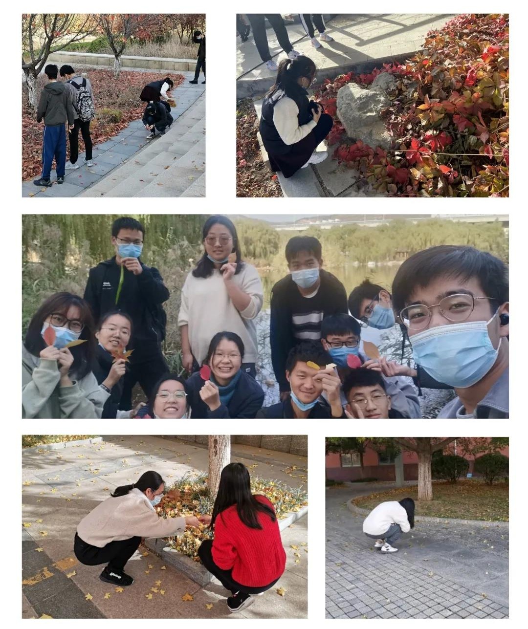 队员集合完毕,为保证礼品精美,杨文静提出了拾捡落叶的要求:落叶应完整、色泽优良、种类多且干湿适宜。队员们分小组分散进行拾捡。过程中,同学认真挑选,不同成员选择各有侧重。最终,同学们拾捡的落叶由杜佳雯进行清洗、压平使之平整干燥,为下一步制作做准备。