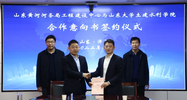 与山东黄河河务局工程建设中心在山东黄河河务局举行座谈会,并签署合作意向书。山东黄河河务局科技处处长李凯,土建水利学院院长张庆松、副院长韩勃、建设中心主任刘兴燕、副主任徐洪增、总工钟传利等有关同志出席了活动。