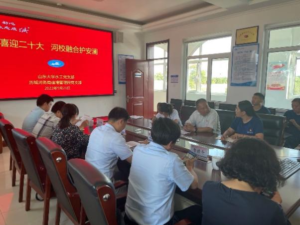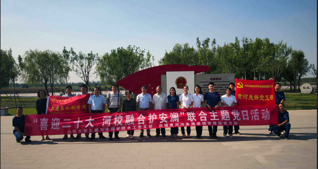 水工党支部与共建单位济南历城黄河河务局遥墙管理段党支部紧紧围绕黄河流域生态保护和高质量发展,联合开展了“喜迎二十大,河校融合护安澜”主题党日活动,学院副院长毛德强、水工党支部书记于翠松、党员教师代表李传奇、王冀鹏、王好芳、王俊和刘胜以及历城黄河河务局副局长郭庆、历城黄河河务局遥墙管理段党支部书记刘瑾一以及管理段全体党员参加了本次活动。