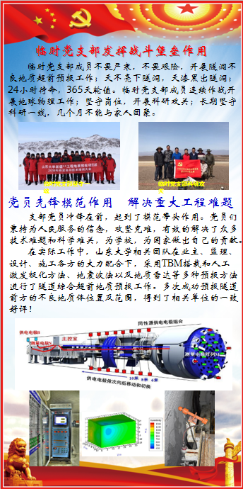 临时党支部不忘初心,开展党建工作:加强党的领导,牢记党建第一责任人要求,认真学习贯彻各级党委的重大决策和各项重要工作;严格整治把关,抓党建与推改革促发展有机融合、协同推进;牢记使命,加强思想建设:临时支部每周开展教育学习,学习党的十九大精神和我校第十四次党代会精神,贯彻落实在科研工作中;凝心聚力,完善组织建设:加大学生积极分子培养力度,抓好入党积极分子队伍建设;砥砺前行,规范制度建设:严格执行落实党的各项组织生活会制度。临时党支部成员不畏严寒,不畏艰险,开展隧洞不良地质超前预报工作,天不亮下隧洞,天漆黑出隧洞,24小时待命,365天轮值。临时党支部成员连续作战开展地球物理工作,坚守岗位,开展科研攻关,长期坚守科研一线,几个月不能与家人团聚。支部党员冲锋在前,起到了模范带头作用。党员们秉持为人民服务的信念,攻坚克难,有效的解决了众多技术难题和科学难关,为学校,为国家做出自己的贡献。在实际工作中,bilibili