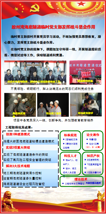 中心在工程现场成立了胶州湾海底隧道临时党支部,发挥党员的先锋模范带头作用,更好地开展现场科研攻关活动。积极发展党员,并建立学生实践基地,开拓新型教育培养模式,建立工地图书馆。临时党支部按时开展党员学习活动,不断加强党员思想教育,凝心聚力,发挥党支部战斗堡垒作用。在临时党支部的鼓舞下,课题组坚守科研一线,开展隧道超前预报、模型试验等工作,保障隧道顺利贯通。在党小组的领导下,出色创造1种建造模式,实现2项重大突破,解决3大技术难题。
