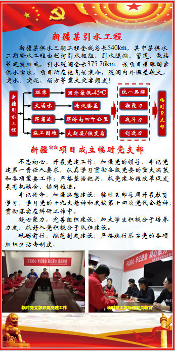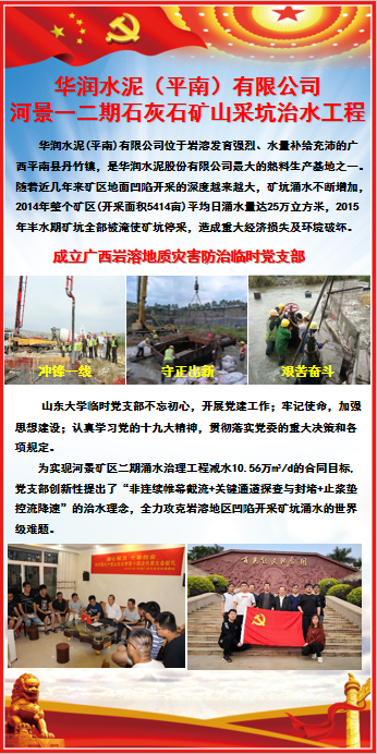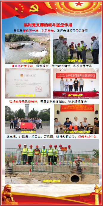临时党支部不忘初心,开展党建工作,牢记使命,加强思想建设,认真学习党的十九大精神,贯彻落实党的重大决策和各项规定。为实现河景矿区二期涌水治理工程减水10.56万m³/d的合同目标,党支部创新性提出了“非连续帷幕截流+关键通道探查与封堵+止浆垫控流降速”的治水理念,全力攻克岩溶地区凹陷开采矿坑涌水的世界级难题。各党员奋战在一线,创新争先,发挥先锋模范带头作用;建立临时党支部,探索适合一线的教育模式,积极发展党员;弘扬和传承民族精神,开展红色教育活动,坚定理想信念;战高温、斗酷暑、顶雷电、冒风雨,进行科研攻关,顺利完成任务。