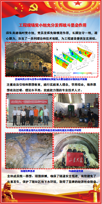师生共建临时党小组,党员发挥先锋模范作用,长期坚守一线,凝心聚力,攻克了一系列理论和技术难题,为工程建设提供坚实保障。注重政治引领和思想教育,践行实践育人理念,学用结合,培养思想政治过硬、理论水平高、实践能力强的专业技术人才。全体成员统一思想、顽强拼搏,确保了隧道安全掘进,有效避免了灾害发生,保护了隧址区地下水环境,取得了显著的经济社会效益。