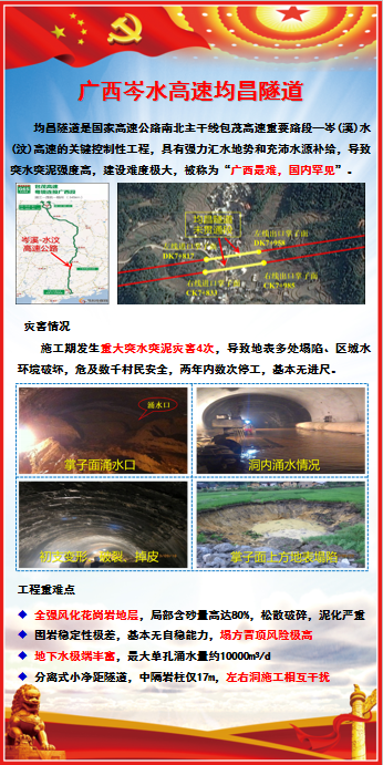 均昌隧道是国家高速公路南北主干线包茂高速重要路段—岑(溪)水(汶)高速的关键控制性工程,具有强力汇水地势和充沛水源补给,导致突水突泥强度高,建设难度极大,被称为“广西最难,国内罕见”。施工期发生重大突水突泥灾害4次,导致地表多处塌陷、区域水环境破坏,危及数千村民安全,两年内数次停工,基本无进尺。
