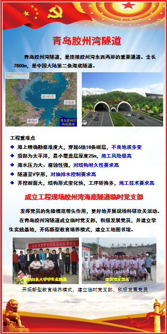 岩土中心的科研项目遍及全国各地,为加强党对师生科研的领导作用,在项目实地设立有临时党支部。本次党员活动室的展板活动依托胶州湾海底隧道工程、新疆某引水工程、华润水泥(平南)治水工程和广西岑水高速均昌隧道,展示党小组在工程现场的战斗堡垒作用。